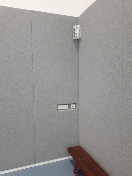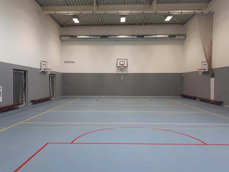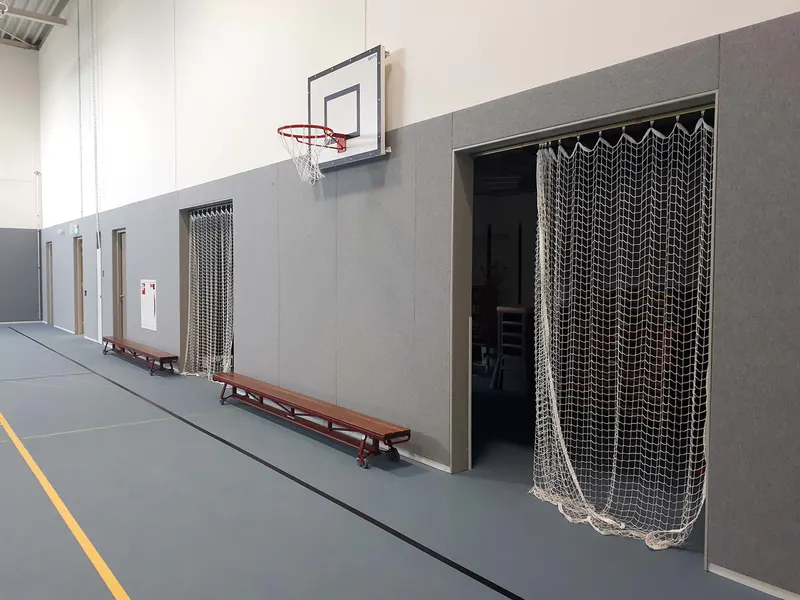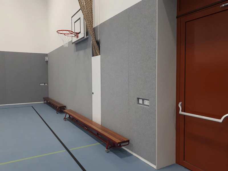 In het Groningse Leek realiseerde BAM Wonen in de wijk Oostindie een prachtige nieuwe brede school met gymzaal: Brede School Oostindie. Vilton Silent Building adviseerde de architect (Inbo) om bij de gymzaal gebruik te maken van Softsonic akoestische wandpanelen van 43 mm. Softsonic staat bekend om zijn uitstekende geluidsabsorberende eigenschappen en is door zijn balvastheid zeer geschikt voor geluidsabsorptie in sportzalen. Zo wordt hinderlijke galm in de gymzaal voorkomen en de spraakverstaanbaarheid verbetert. De akoestische panelen zijn door onze collega’s van Vilton Silent Building op maat gemaakt in de eigen fabriek in Lelystad. Vervolgens hebben onze vakmensen deze grijze panelen op locatie aan de gymzaalwanden bevestigd.