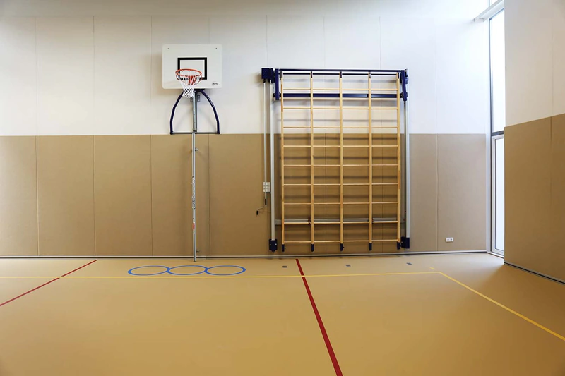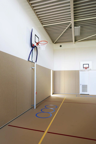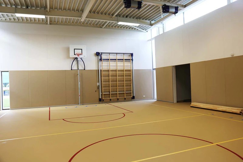 In De Bilt staat IKC De Regenboog. Een IKC (‘Integraal Kindcentrum’) is een soort brede school waar verschillende organisaties samenwerken op het gebied van onderwijs en kinderopvang. Vilton Silent Building adviseerde het verantwoordelijke architectenbureau, Kristinsson Architecten, over een akoestische oplossing voor de galm in de gymzaal: Softsonic akoestische panelen op de lage én hoge wanden. Deze panelen werden op maat gemaakt in onze eigen fabriek en aangebracht door onze vakmensen. Op de lage wanden zijn Softsonic 53 mm panelen in de kleur lama gemonteerd en op de hoge wanden witte Softsonic panelen van 23 mm. Aan de onderzijde is een zilverkleurige plint geplaatst. De wanden vormen één geheel met de sportvloer die eveneens in de kleur lama is. En met de akoestische prestatie in de gymzaal zit het goed: de nagalmtijd is zeer laag en voldoet hiermee aan de normen van de KVLO.
