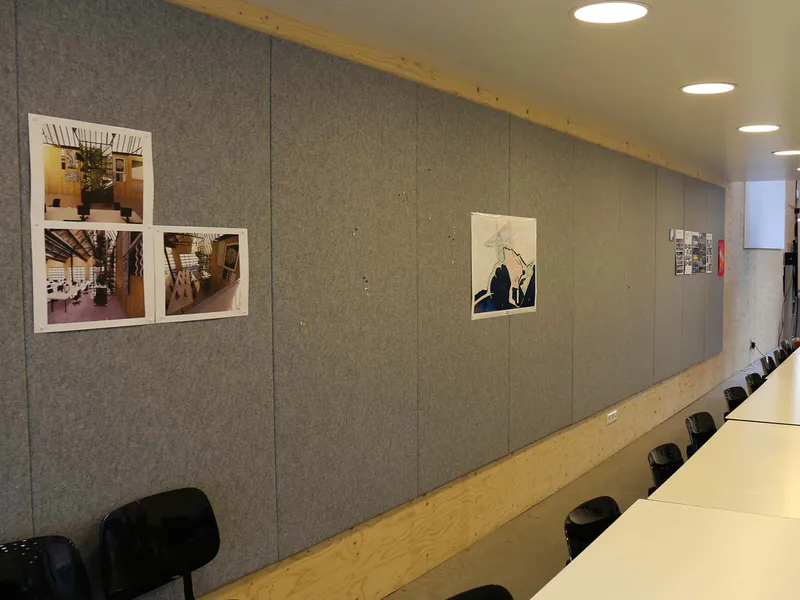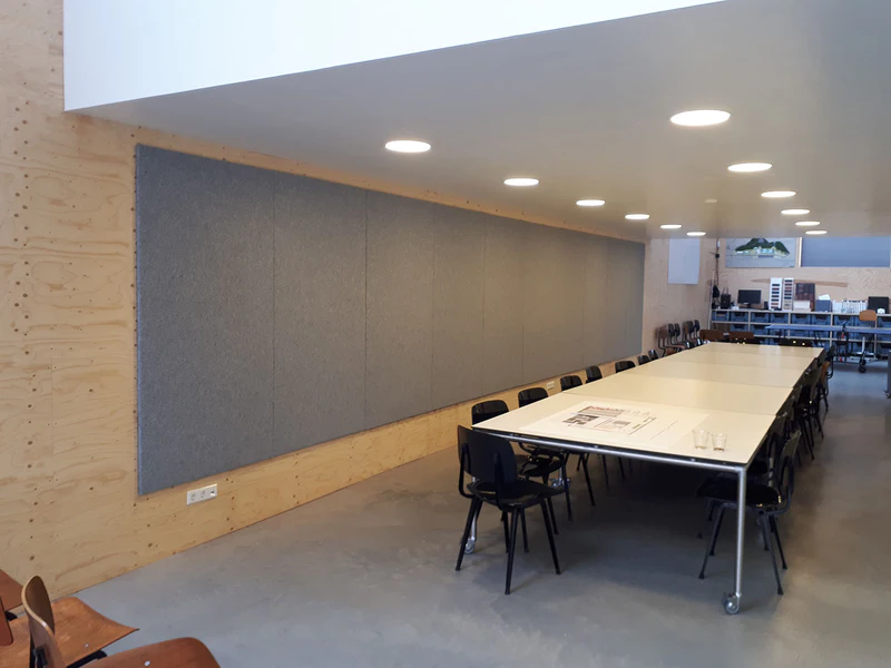 Architectenbureau Karres en Brands in Hilversum zocht voor een vergaderruimte naar een prikbord van 20m² met akoestische eigenschappen én een mooie uitstraling. De akoestisch adviseurs van Vilton Silent Building adviseerden Softsonic wandpanelen. Softsonic heeft zeer goede geluidsabsorberende eigenschappen, voorkomt galm in ruimten en verbetert de spraakverstaanbaarheid. Dit in combinatie met de fraaie looks, maakte het geschikt voor deze toepassing. De Softsonic wandpanelen (23 mm, in de kleur grijs) werden op maat gemaakt en geplaatst door onze vakmensen. Een goede akoestiek in combinatie met een fraaie look!