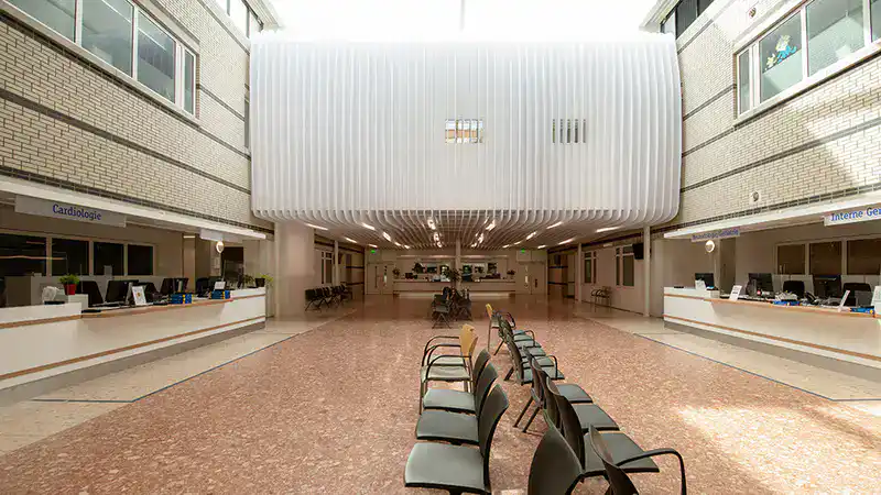 Twee hightech hybride OK’s zweven nu boven polipleinen in het OLVG. Architect Eric Wendel ontwierp de operatiekamer als lichtvoetige ronde vorm, zoals een zwevende wolk.