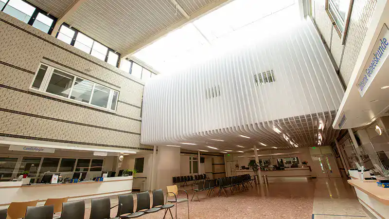 Het materiaal werd zorgvuldig getest in de grote wachtruimte. Zo vormde zich uiteindelijk de keuze voor een ontwerp met vlakke vilten stroken, die Vilton heel eenvoudig met een systeem kon inladen en uitsnijden. De akoestische platen vallen als puzzelstukken in elkaar en kunnen goed bevestigd worden aan de constructie. Daarnaast is het materiaal gemaakt van PET-vilt: de panelen bestaan voor 95% uit gerecyclede PET-flessen. Dat staat gelijk aan 65.000 PET-flessen! Het eindresultaat van het kunstobject vormt na oplevering het zwevende tegengeluid boven de polipleinen waar de architecten naar zochten.