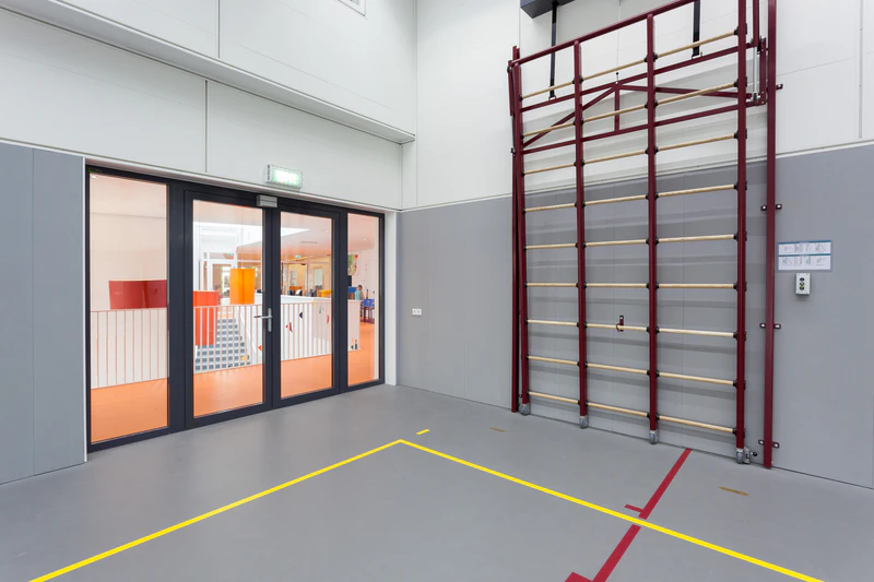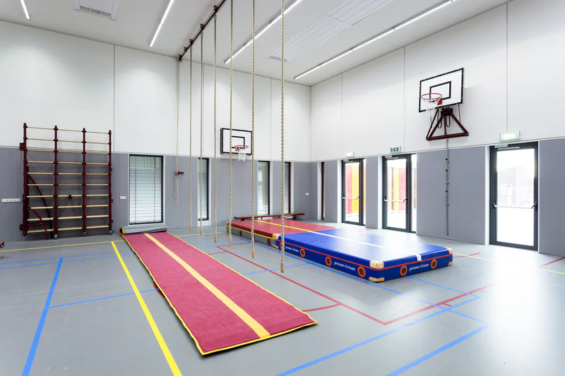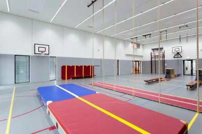 Sport maken van ruimte-akoestiek! Daar ligt onze uitdaging. En met het resultaat in de gymzaal van de brede school Villa Vlinderhof, waarin een openbare basisschool, een kinderopvang en een multifunctionele gymzaal zijn ondergebracht, zijn we dan ook erg tevreden. Zowel op het gebied van ruimte-akoestiek als trillingsdemping. De professionals van Vilton hebben hier eerst een hoogwaardige zwevende akoestische vloer geëngineerd en geplaatst. De gymzaal van Villa Vlinderhof bevindt zich namelijk op de eerste verdieping, zodoende is er een verhoogde akoestische eis aan de gymzaalvloer gesteld. Daar past natuurlijk niets minder dan een hoogwaardige geluidsabsorptie tegen de wanden bij. Daarom zijn hier onze Viltsonic Sport akoestische wandpanelen geplaatst. De akoestische wandpanelen zijn hier op afstand van de constructiewanden geplaatst. Hiervoor hebben wij eerst een raamwerk gemonteerd. De akoestische wandpanelen zijn daarna aan het raamwerk bevestigd met een akoestische ontkoppeling. Trillingen worden hierdoor niet doorgegeven via de wanden en de gewenste eisen aan de nagalmtijd worden behaald. Daarnaast is het gewoon een veilige en visueel rustige gymzaal geworden.