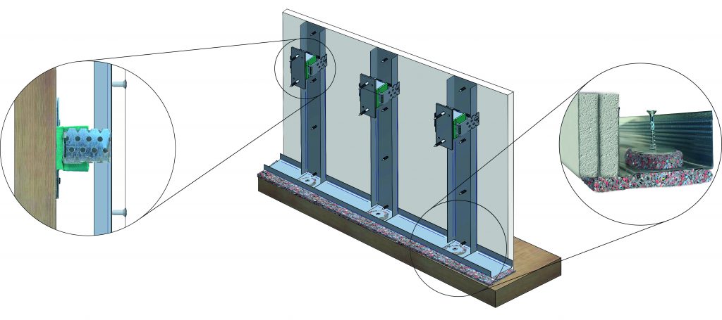 Met het Vilton TOR-Wand Systeem wordt een flexibele of buigslappe voorwand gecreëerd. Het systeem vermindert de doorgifte van contactgeluid en is eenvoudig aan te brengen. Wandbeugels stabiliseren de voorzetwanden en rubberen ringen zorgen ervoor dat de bevestiging ontkoppeld wordt, waarna de metal stud mechanisch met de ondergrond verbonden kan worden. Om geluidslekken te voorkomen, wordt er aan de boven- en zijkant van de voorzetwanden een zelfklevende rubberen granulaatstrook geplaatst.