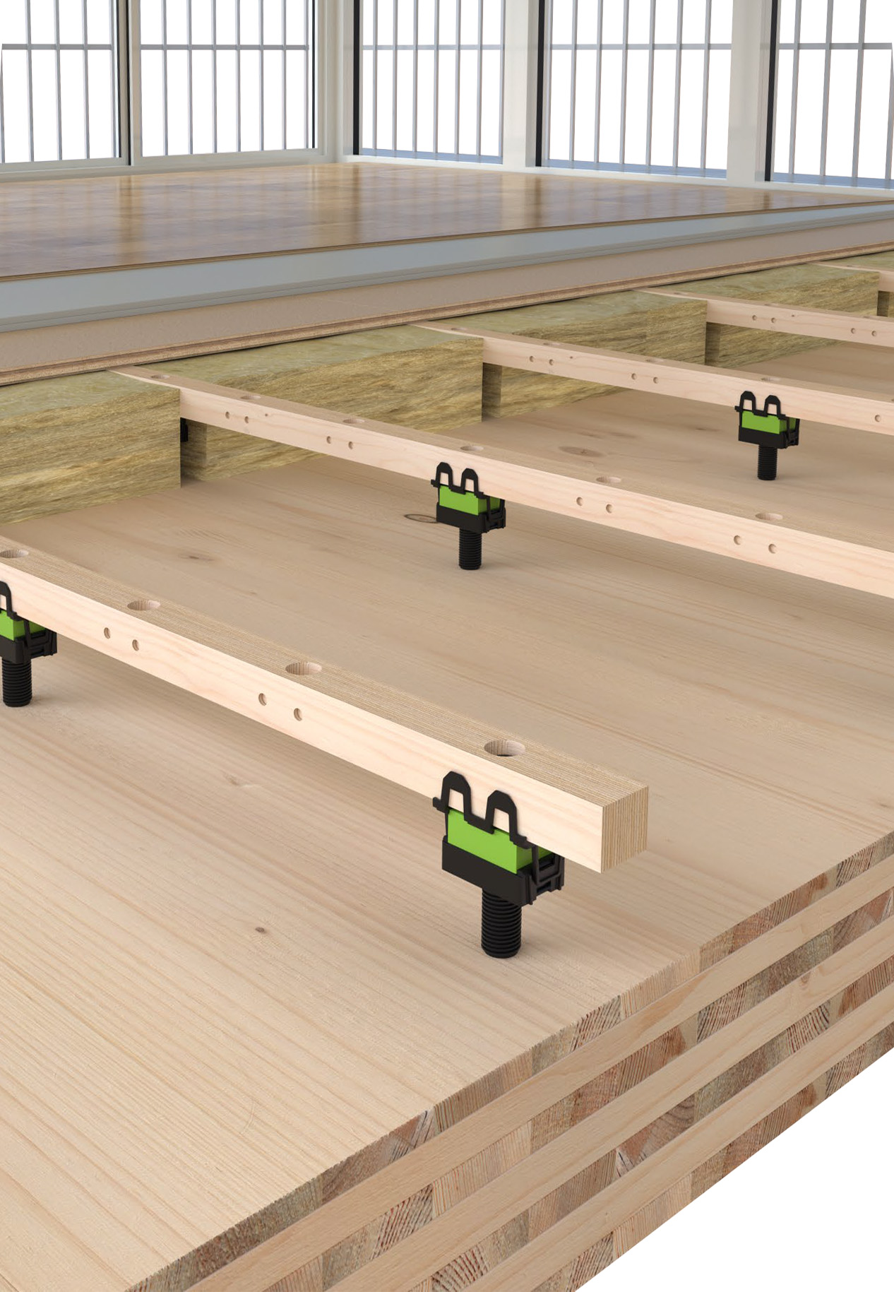 Het Vilton® Granab® 8000W vloersysteem wordt toegepast om een verbeterde lucht en contactgeluid te realiseren. Vilton® Granab® 8000W vloersysteem is ontworpen voor houtbouw doordat de lat van hout is in plaats van staal. Het Vilton® Granab® 8000W vloersysteem in hoogte verstelbaar van 95 tot 470 mm. Hierdoor kunnen gemakkelijk leidingen in het vloersysteem verwerkt worden. Met het Vilton® Granab® 8000W vloersysteem kunnen goede geluidsisolerende vloeropbouwen bereikt worden in hotskeletbouw constructies. Daarnaast is het mogelijk om dunnere betonvloeren toe te passen en toch een hoogwaardige geluidisolatie te bereiken. In zulke constructies heeft het Vilton® Granab® 8000W vloersysteem een 50% lagere CO2-impact. Vilton® Granab® 8000W is geschikt voor toepassingen in appartementen, scholen, kantoren en openbare gebouwen. Naast de in hoogte verstelbare latten, kunnen de pads in het systeem in 3 diktes worden uitgevoerd om de geluidsisolatie te verhogen.