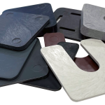 Stel- en uitvulplaten van 70 x 70 mm. Ten behoeve van tijdelijke ondersteuning. Leverbaar in diverse diktes vanaf 3 mm, met gaten of sleuf. Elke dikte heeft een eigen kleur. Stelplaten van 100 x 100 mm zijn op aanvraag leverbaar.